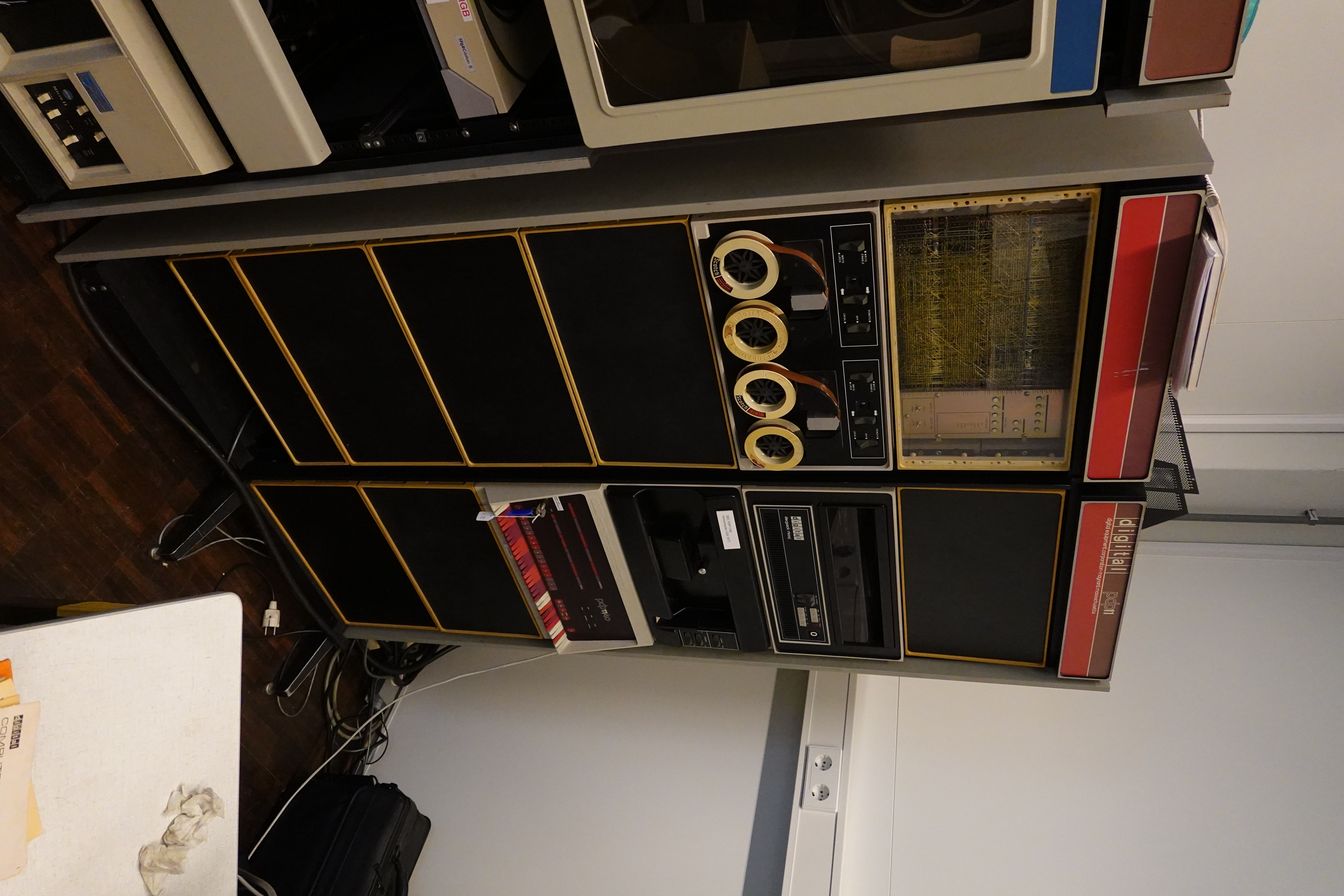 The PDP-11 architecture, introduced in 1970, was designed to cover a wide range of price/functionality ratios. The PDP-11/40 (1973) is the direct descendant (in the equal-cost/increasing-functionality line) of the PDP-11/20, the root of the PDP-11 family tree. Our machine has 8k 16-bit words of core memory and is equipped with a fast papertape reader/punch, an RK-05 cartridge disk unit, a double DECtape unit and a pair of RX-11 8" single-sided floppy drives. The presently used console is a DECwriter II matrix printer, replacing the original Teletype 38 ASR unit shown in the picture. This machine has been used for a long time (1973-1990) as a local data concentrator for the Cyber mainframe computer at the University Computing Centre (SARA). Running the RT-11 operating system, this PDP-11/40 is still in use in our museum as a host for various peripherals among which a Documation punched card reader. The picture shows the PDP-11/40 in its original state. There is also a close-up of the console and papertape reader/puncher.